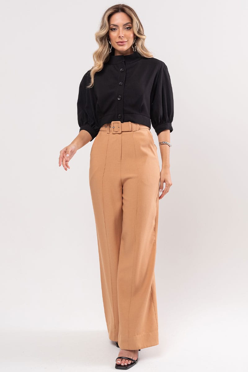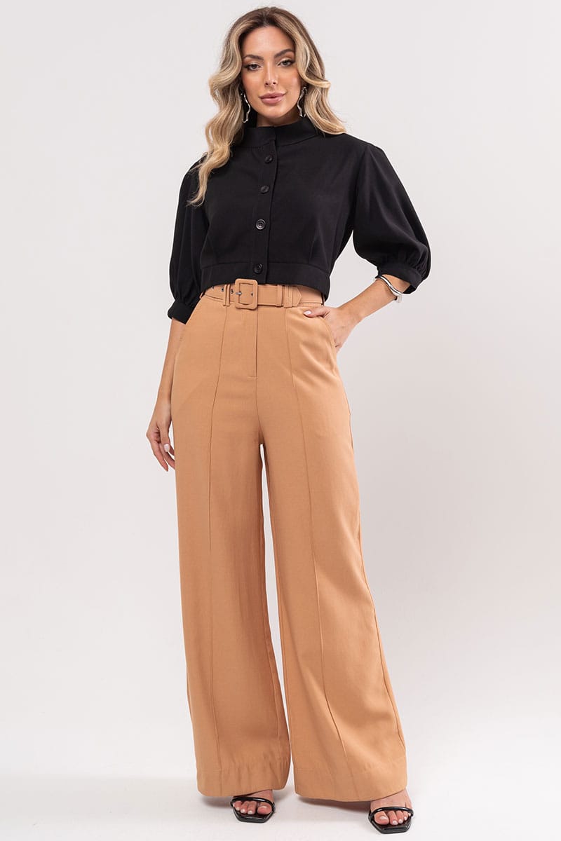 Calça Miss Misses Alfaiataria c/cinto Caramelo, botão forrado, bolsos, pantalona.